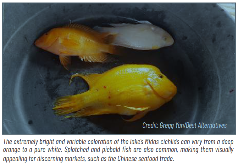 Some fish farmers have passively started to catch and sell wild Midas cichlids when they visit their floating bamboo farms, using everything from nets and poles to pneumatic spear guns. As the fish now multiply naturally in the lake, farmers have spotted a golden opportunity to supplement their earnings.