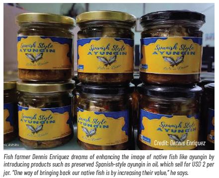 Though the world might see commercial-scale ayungin farms in the future, most of the fish are still sourced wild. Fishers in Lake Sampaloc still pull out a combined total of around 10 kilograms of the silver fish daily. “One way of protecting our native fish is by increasing their value,” says local farmer Dennis Enriquez, who is developing new products to help market the once-popular native fish. “I’m now working on a line of Spanish-style ayungin bottles, which retail for around USD 2.” The preserved fish offer something different from preserved tuna or milkfish and Enriquez hopes they could become a future seafood commodity in the Philippines.